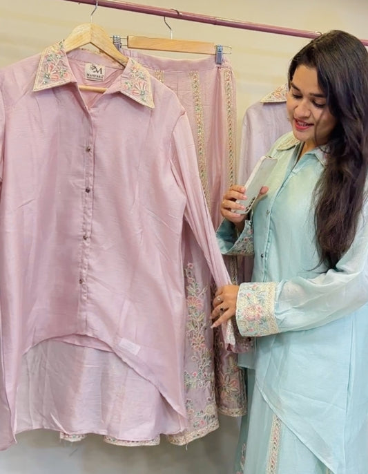 Blue Color Hand Embroidered Viscose Rayon Ready Made Co-Ord Set