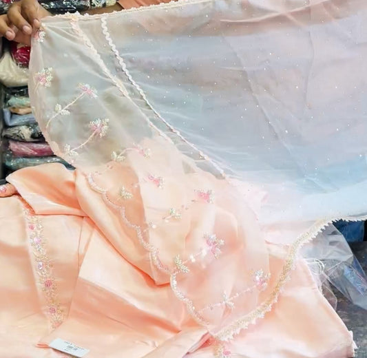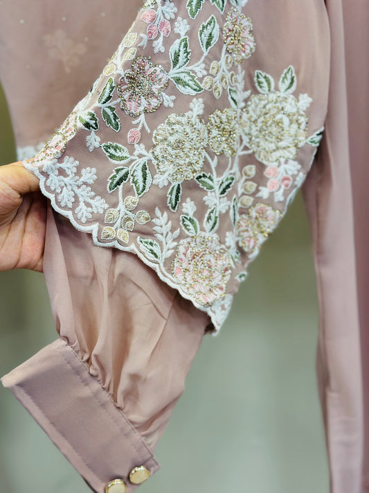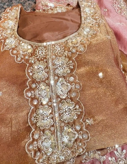 Dark Peach Embroidered Burberry Chiffon Readymade Sharara Set