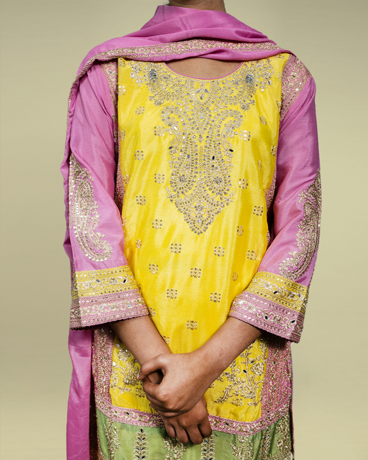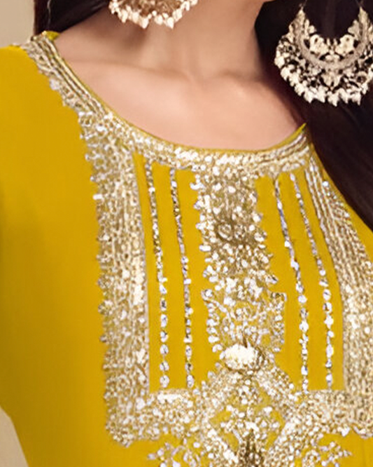 Mustard Yellow Emboidery Heavy Chinon Readymade Sharara Set