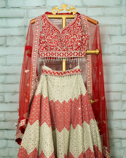 Red Heavy embroidered Netted Readymade Lehenga